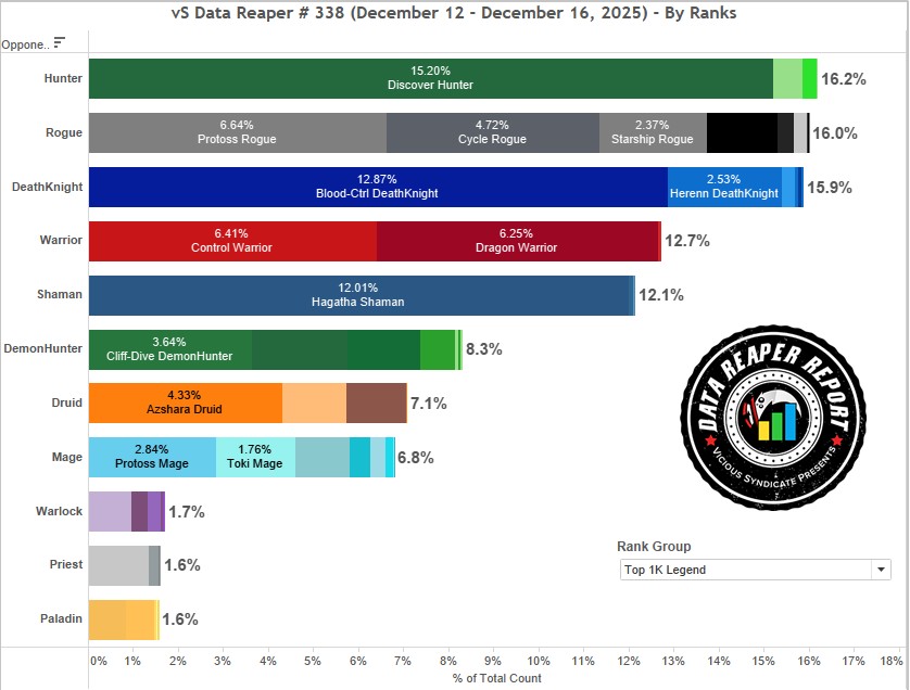 Hunter maintains a middling play rate throughout most of ladder before hitting a high play rate at top legend. Discover Hunter remains split between the Elise build and the non-Elise burn variants.