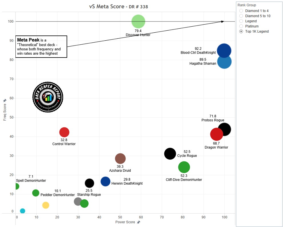 • Blood-Ctrl DK is just very strong. Well-rounded matchup spread with no hard counters, which are similar traits to Discover Hunter, but even better overall win rate. Azshara Druid has moved towards a build that does not counter it either. Herenn DK is fine, but inferior.