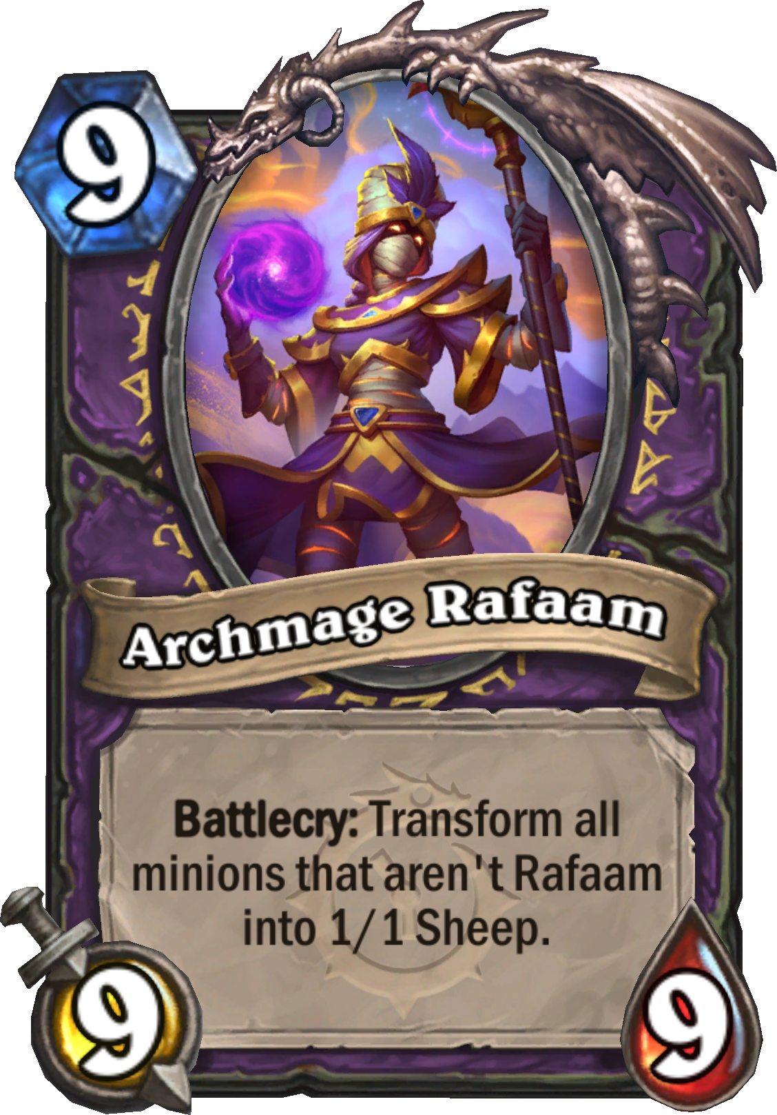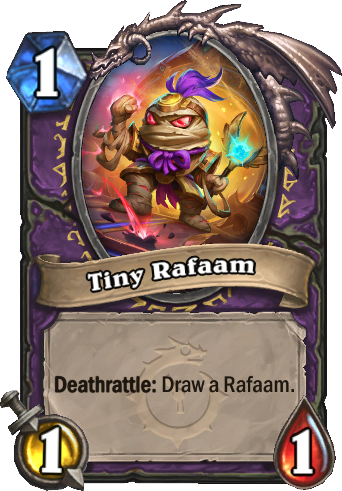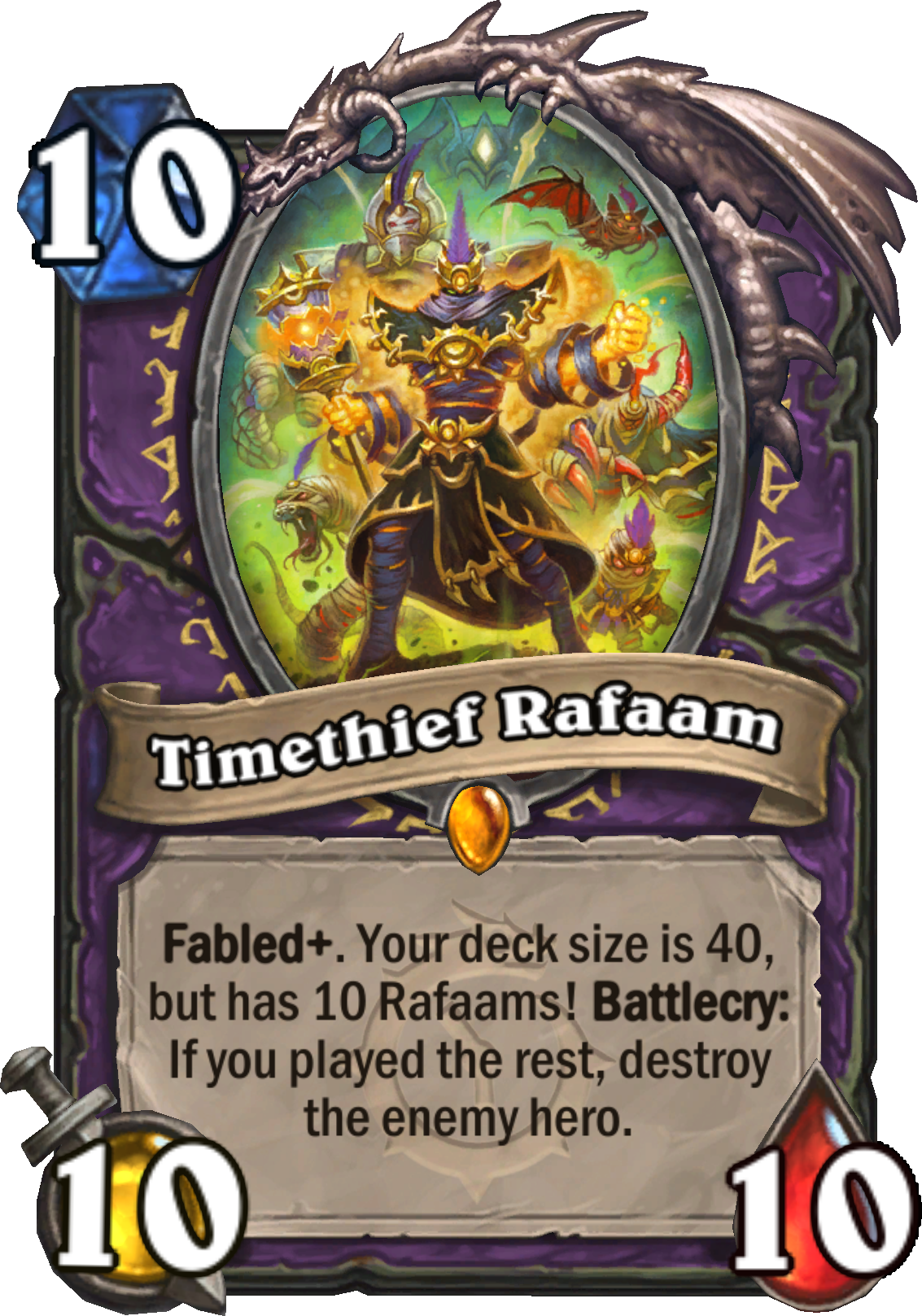 Earlier today, the most unique fabled legendary was revealed for the Warlock class. Rafaam increases our deck size to 40 and wins the game if we managed to play all the different Rafaam minions before dropping the 10 mana legendary.
