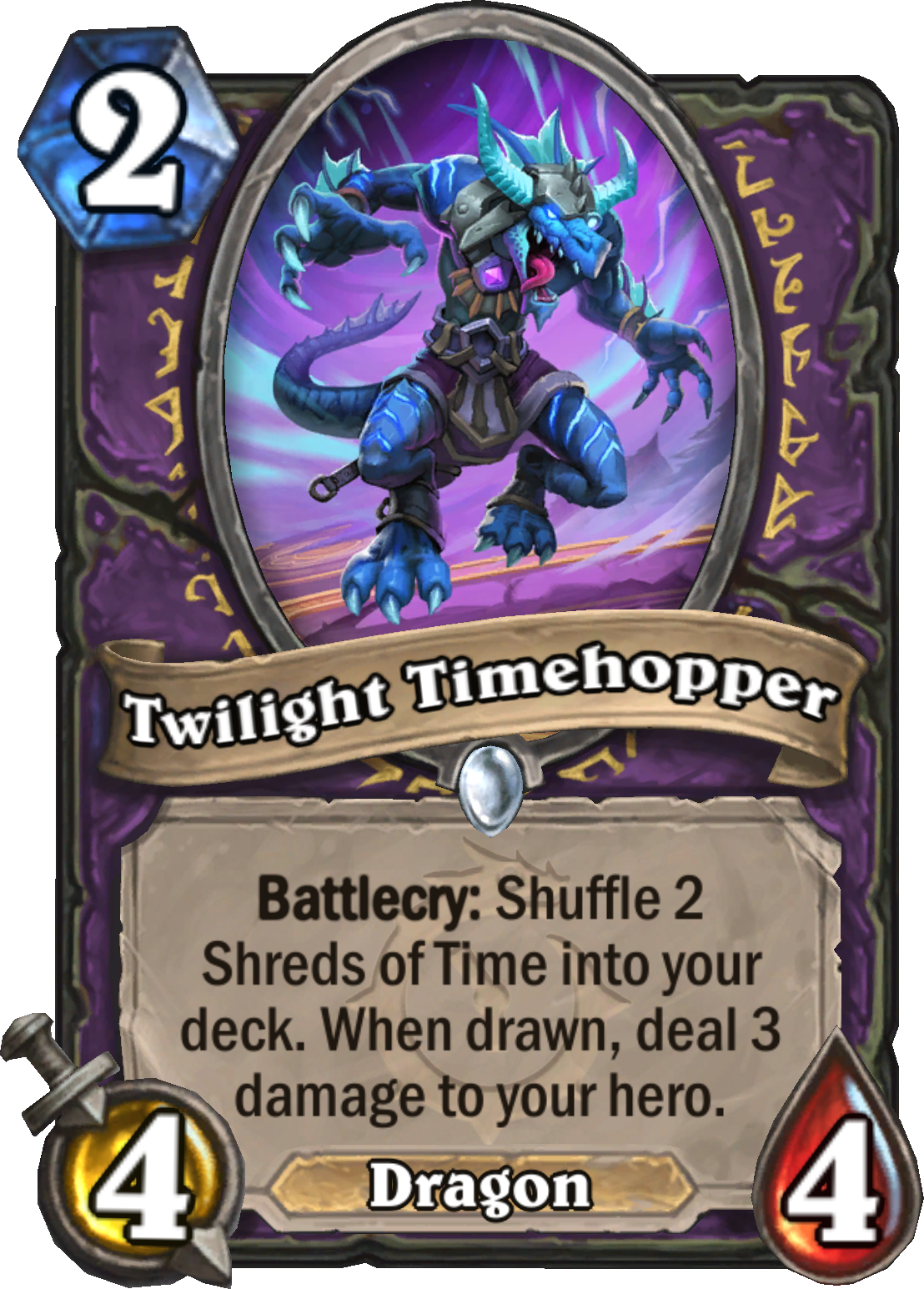 The class’ biggest package of this set involves Shreds of Time, a ‘cast when drawn’ spell we shuffle to our deck that deals 3 damage to our own hero. This is the price we pay for powerful effects on a special discount. For example, the first revealed card from this package is Twilight Timehopper, a 2 mana 4/4.