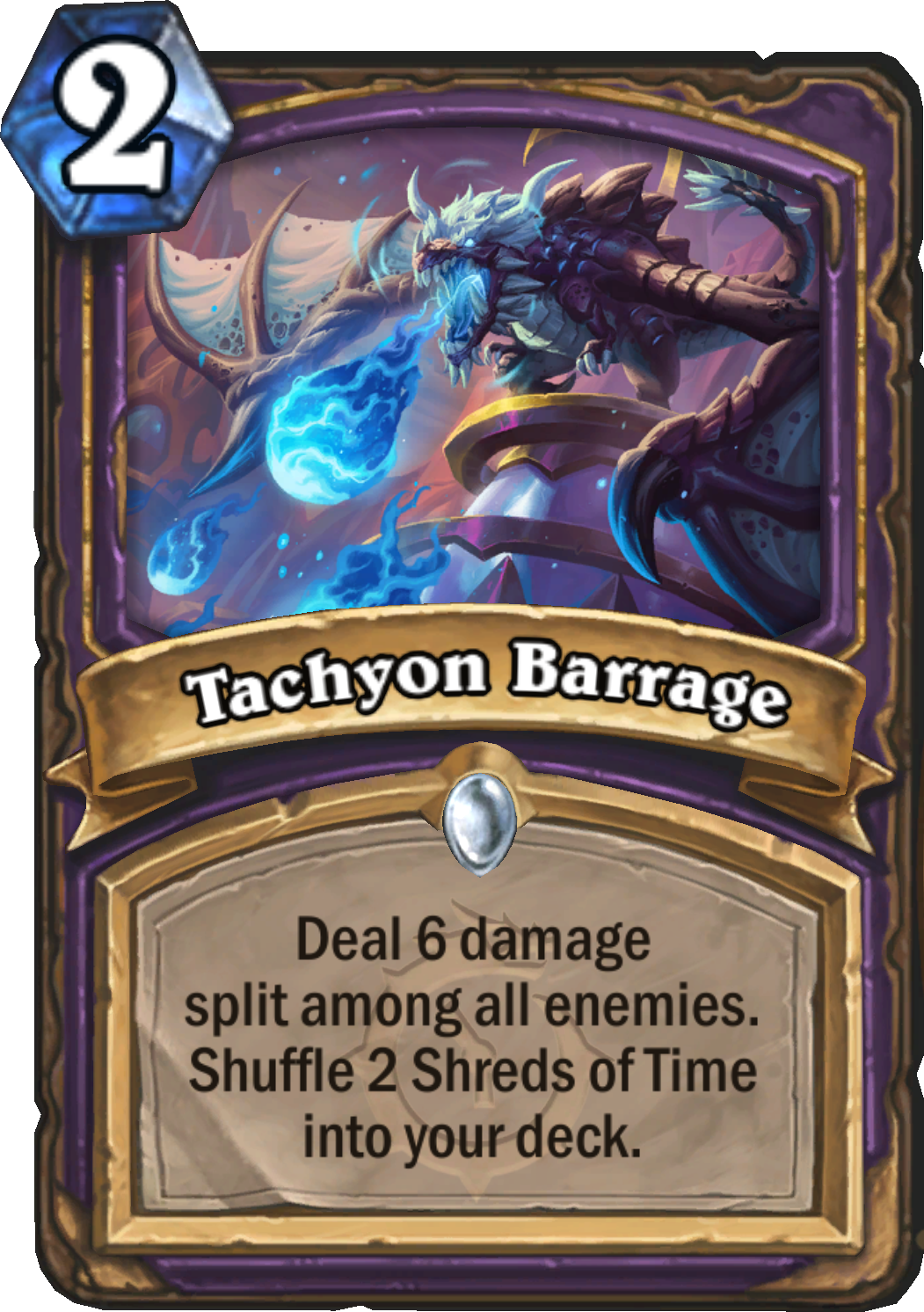 A Sigil of Cinder with no delay is easily worth 3 mana. Tachyon Barrage offers a full mana discount for the Shred of Time drawback. This spell is also an amazing enabler of Devious Coyote, which might be the strongest neutral in the set for aggressive decks.