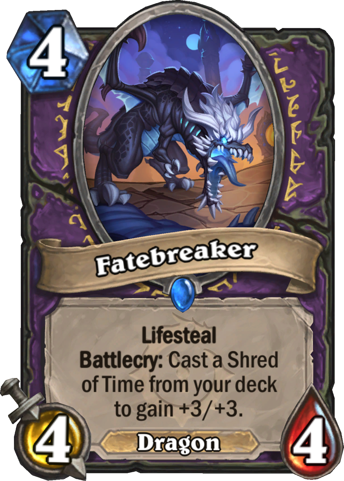 Fatebreaker deals 3 damage to us immediately by casting a Shred of Time from our deck but grows into a 4 mana 7/7 when it does. The lifesteal keyword means that Fatebreaker may end up gaining us more life than it costs us. It is extremely threatening in both faster and slower matchups as a result.