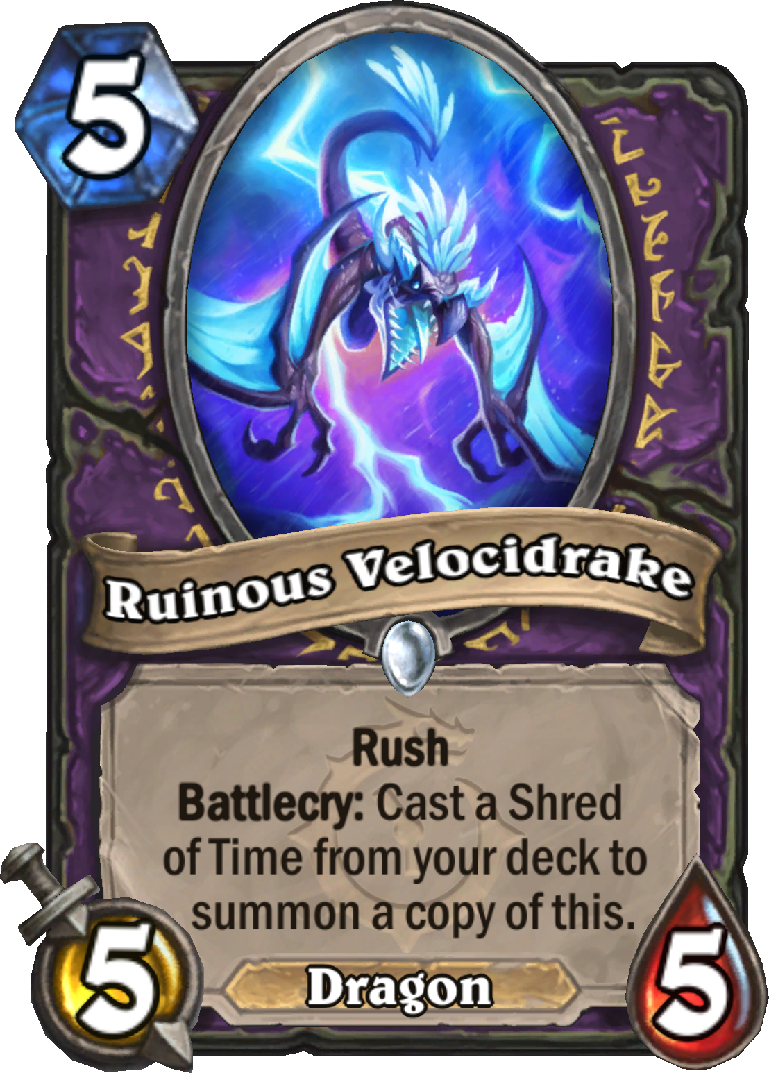 Velocidrake also casts a Shred of Time from our deck, turning into a 5 mana 10/10 with rush across two bodies. This is a gigantic swing card in the mid-game, one that may end up saving us more health by dominating the board in faster matchups, while representing 10 attack in slow matchups.