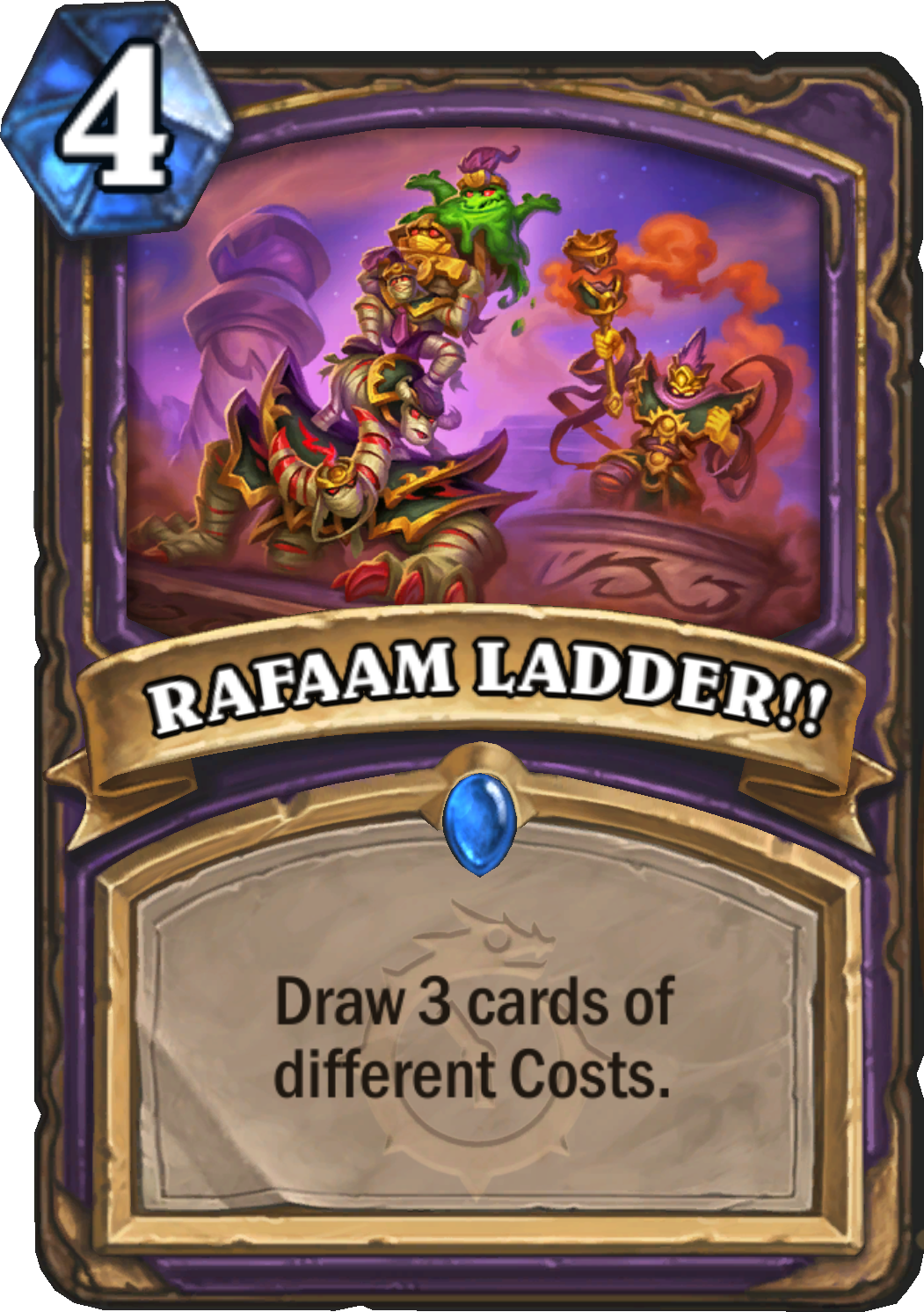 While Rafaam offers us a clear win condition in late game matchups, the increased deck size and need to find and play every Rafaam is a big challenge, both in time and resources. Thankfully, Warlock is getting some card draw to help us find the Rafaam minions more consistently with ‘RAFAAM LADDER!!’.