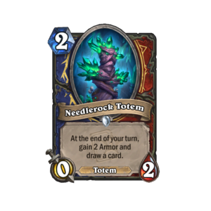A much stronger version of Mana Tide Totem. Needlerock Totem costs 2 mana with 1 less health (worthwhile tradeoff by itself), while also gaining 2 armor at the end of every turn. Just recently, a very similar card in Gold Panner has ended up constructed worthy. Needlerock Totem is arguably better because of the armor gain. The opponent just cannot ignore it.