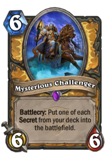 Because TGT introduces so many new mechanics and card interactions, picking one specific card that I think is underrated is a difficult task. Without testing these cards it’s difficult to predict what the next Dr. Boom or Emperor Thaurissan will be. Keeping this in mind, I’m going to go out on a limb and say that I feel Mysterious Challenger is pretty underrated. Mysterious Challenger is a 6 mana 6/6 paladin class minion that has Battlecry: Put one of each secret from your deck into the battlefield. At first glance, this card appears to be a Mad Scientist on steroids. However, you have to figure in that paladin secrets are 1 mana and generally less impactful than hunter or mage secrets. While this makes the card weaker, the ability to pull out multiple secrets at one time, coupled with the fact that paladin secrets can interact with each other, leads me to believe that this card is actually quite strong. For instance, if you play Mysterious Challenger as the only minion on your board and it brings Noble Sacrifice and Avenge into play, your opponents next attack will trigger noble sacrifice, which will then trigger avenge on your Mysterious Challenger, making it a 6 mana 9/8 minion that stopped your opponents attack and successfully thinned your deck by two cards. The new paladin secret, Competitive Spirit, also could be a strong target for Mysterious Challenger, creating the possibility for immediate tempo on an established board. While it may not be a game defining card, I feel that Mysterious Challenger could potentially create a successful secrets paladin archetype that I’m excited to test myself. From an arena perspective, this card represents a solid late game body and the potential for some much needed tempo.