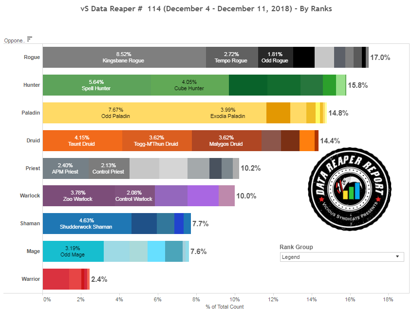 While Hunter is the most popular class outside of legend, Rogue takes over at Legend. Kingsbane Rogue has become a meta-defining deck with the addition of Raiding Party, and the most popular deck at higher levels of play. The class is also seeing plenty of experimentation with some seriously janky decks. The unchanged Odd Rogue is followed by a plethora of aggressive decks, utilizing pirates to various degrees (Tempo Rogue, Pirate Rogue and Even Rogue) and late game focused decks that have been overshadowed by Kingsbane Rogue (Quest, Malygos, Cube).