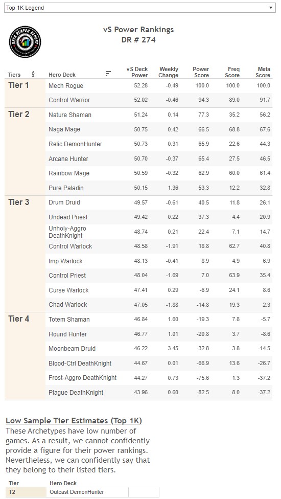 - Mech Rogue is unflappable. You’d think the high presence of defensive control decks would dent its performance levels, but the deck looks extremely resilient. It’s become the most popular and most powerful deck at top legend. This deck is the closest thing we have in the format to a “power outlier”, but it’s not there.