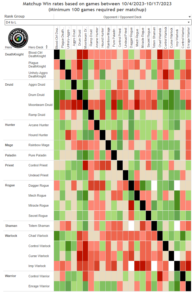 - Pure Paladin remains competitive throughout ladder, with its Ramp Druid matchup keeping it relevant at higher levels of play. An increased presence of Secret Rogue is causing an issue though.