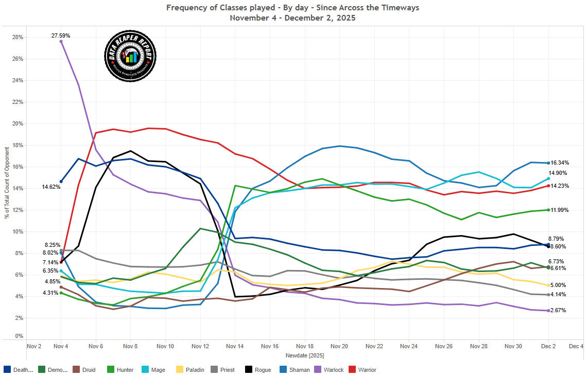 Control Warrior is maintaining a consistent and steady play rate across all levels of play. Dragon Warrior is mostly in decline, but interestingly, it is rising in play at top legend.