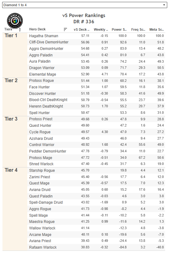 - Hagatha Shaman is unmoving. It remains the best deck on ladder outside of top legend. Has gotten stronger at top legend due to the decline of Discover Hunter. However, there is now an effective answer to Shaman if you are not a high MMR player. The Elise variant of Cliff Dive DH is a reliable counter and one of the best decks on ladder in general.