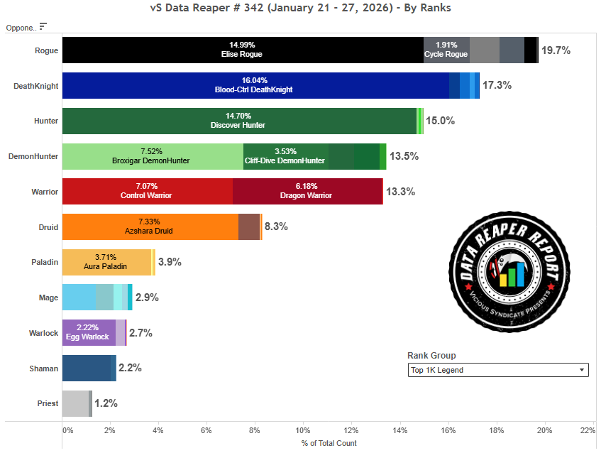 Discover Hunter has surged at top legend, more than doubling its numbers over the last week. The class remains relatively unpopular at other rank brackets.
