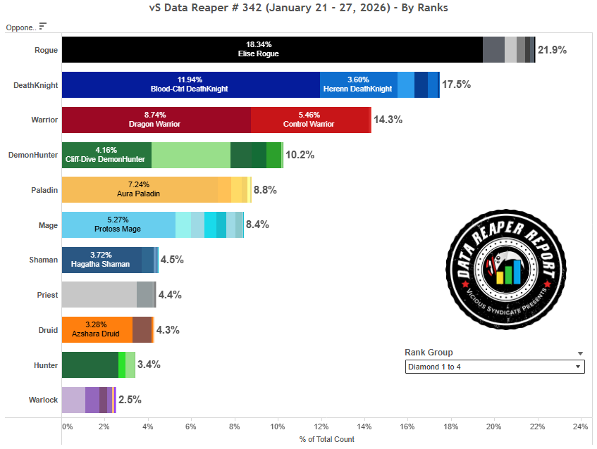 • Control Warrior has some brutal counters, but what keeps it competitive and performing at a decent level are good matchups into Rogue, Demon Hunter, Hunter and Death Knight. That is a large chunk of the format.