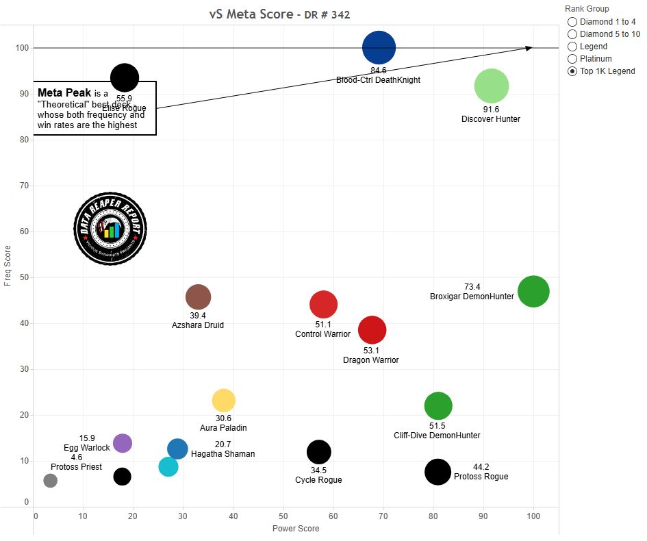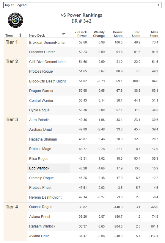 • The rise of Discover Hunter at top legend has crippled Egg Warlock’s performance, which has nosedived from Tier 1 to Tier 3 within a week. The deck is still great for the climb to legend, but is not attractive due to being old.