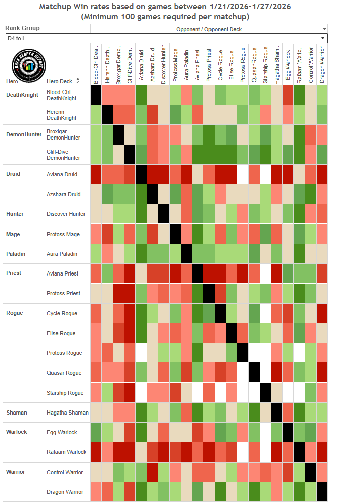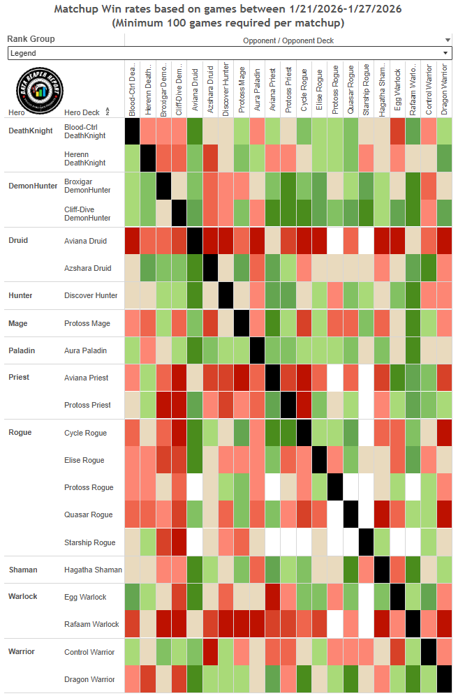 • Protoss Rogue is also doing well. Its top legend standing has improved thanks to its strong matchup against the rising Discover Hunter.