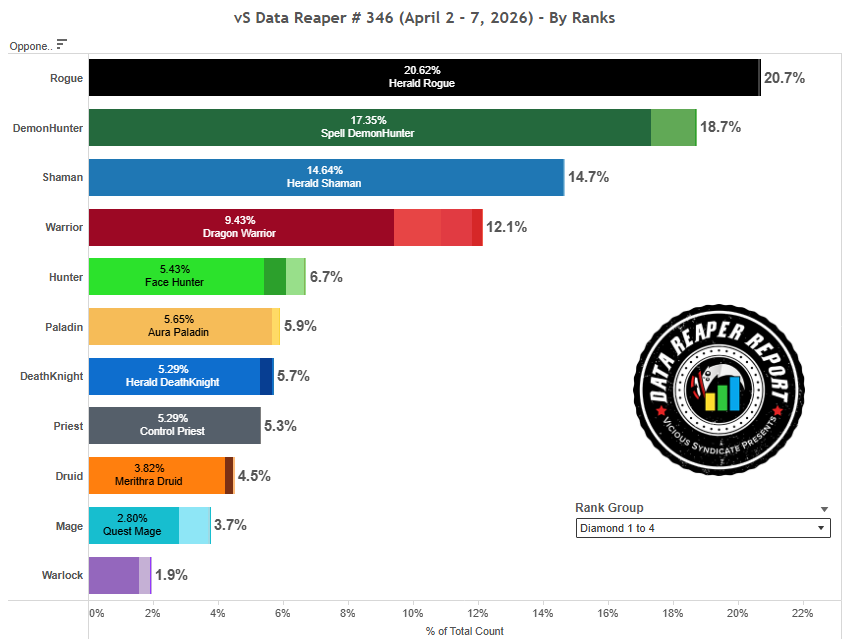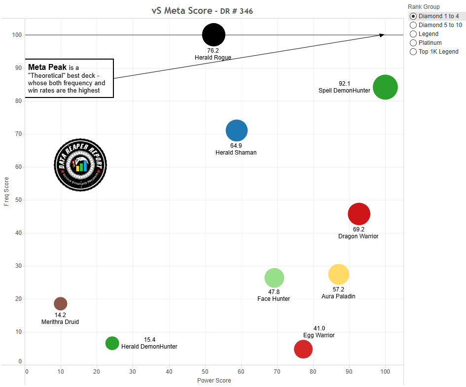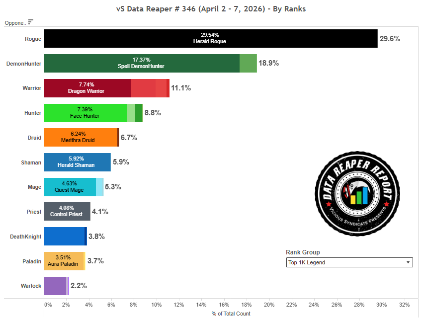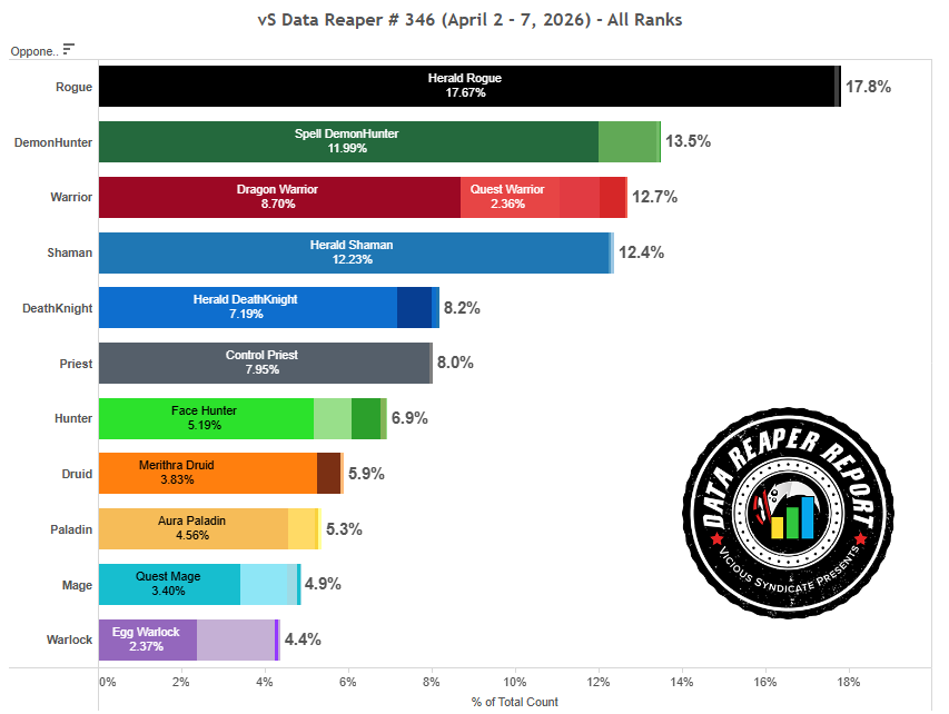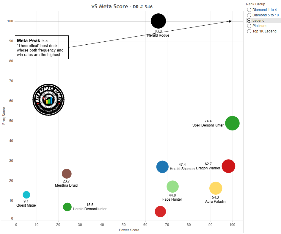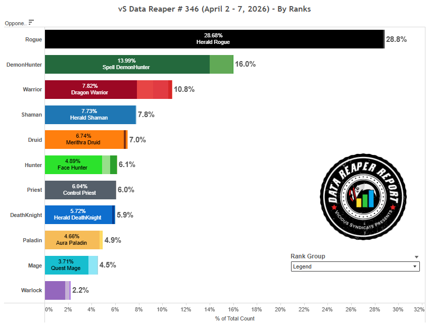 Herald Shaman remains a popular deck at lower MMRs, but the deck has gone through a drastic decline in its play rate across ladder. At legend ranks, its presence is dwarfed by Rogue and Demon Hunter.