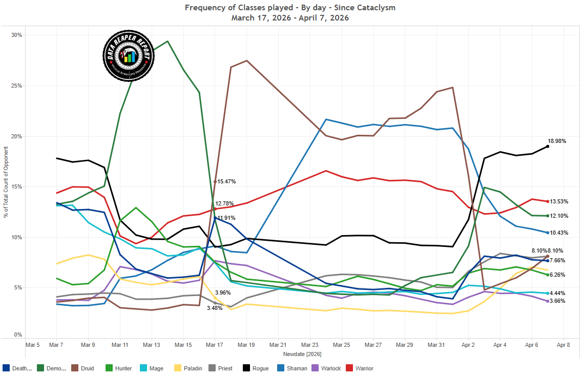 The biggest story of the first balance patch of Cataclysm is the explosion of Herald Rogue. This deck has taken over ladder at all levels of play, peaking at top legend with a 30% play rate.