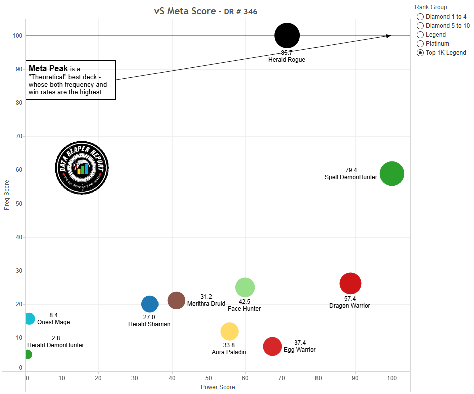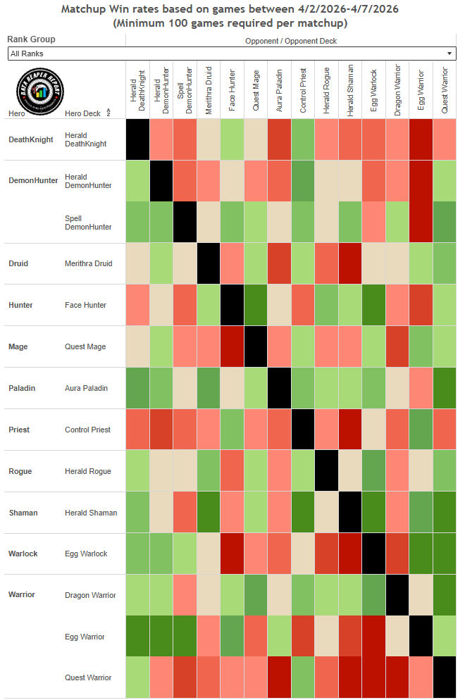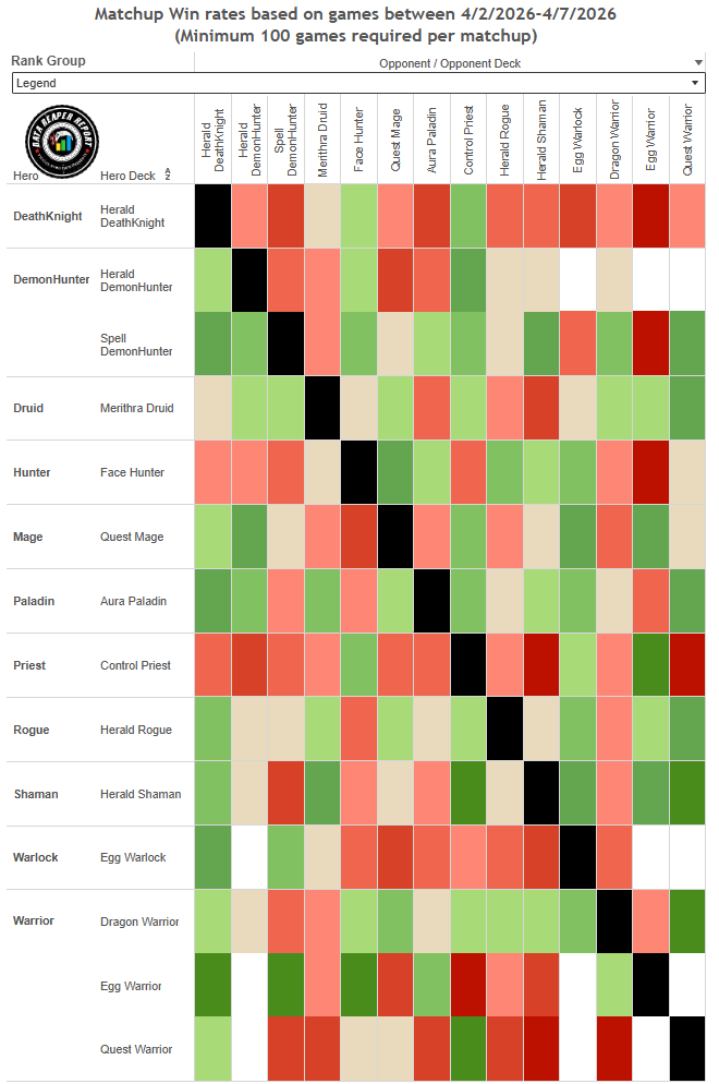 - Herald Shaman looks fine, though significantly weakened in most rank brackets compared to its pre-patch standing. It tends to stomp on bad, or fringe decks, which suggests it may not perform as well in a settled format. At top legend, this is more apparent. Herald Rogue is superior against a field with a larger percentage of meta contenders. However, a possible rise in Merithra Druid and/or Egg Warrior could end up flipping the trend.