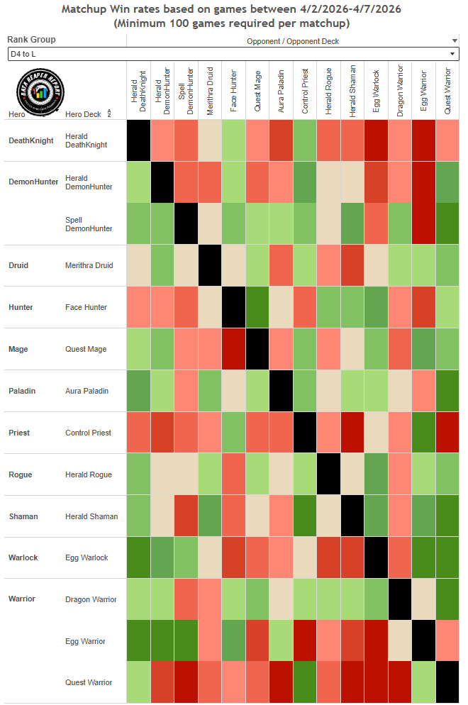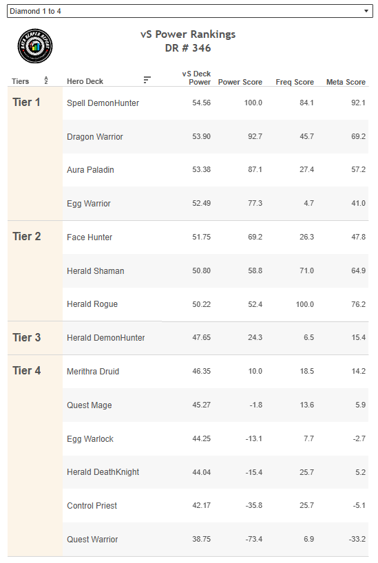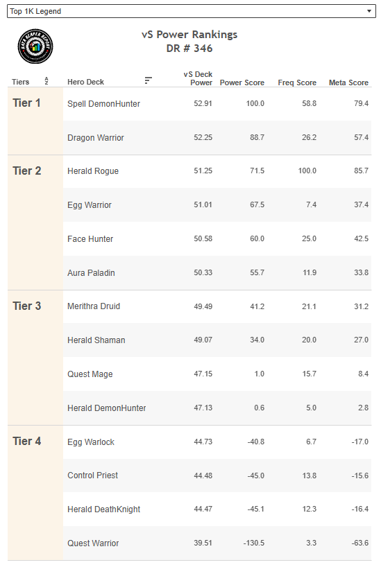 - Dragon Warrior looks strong, a possibly underrated deck on ladder. It has a strong matchup against Herald Rogue but loses to Spell DH. The player base’s preference for Rogue, which stops Spell DH from taking over ladder, means that Dragon Warrior counters the most popular deck in the game, leading to its Tier 1 standing.