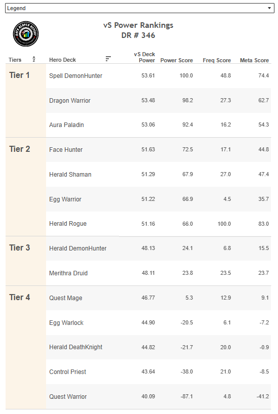 Class/Archetype Distribution | Class Frequency | Matchup Winrates | vS Power Rankings | vS Meta Score | Class Analysis & Decklists | Meta Breaker of the Week | How to Contribute | Credits