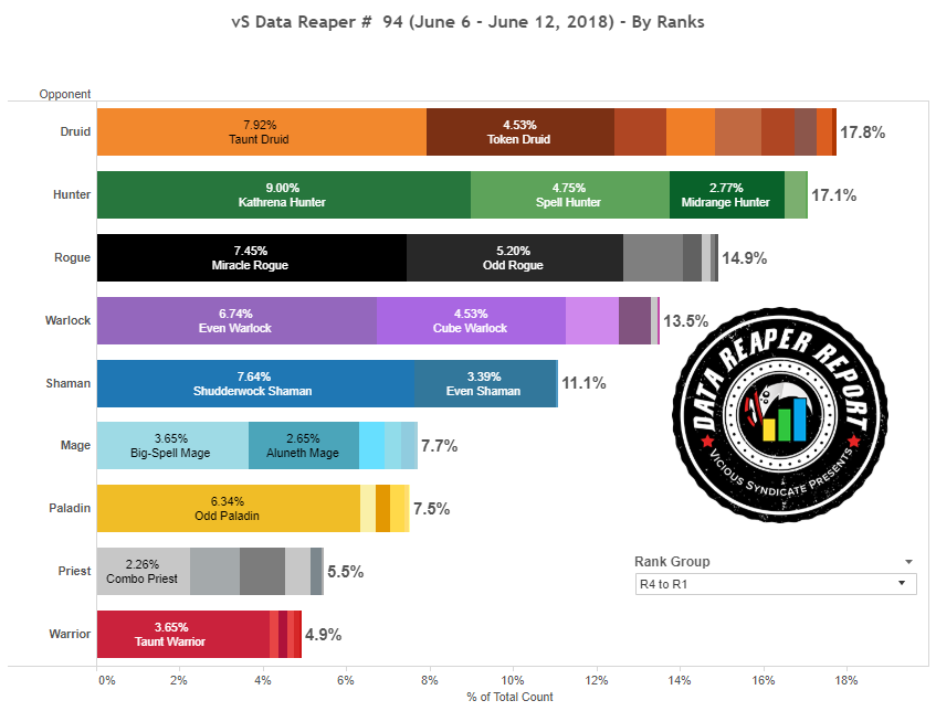 Warrior has sunk back to the bottom. It is the least popular class at every rank bracket. All of its archetypes, with the exception of Taunt Warrior, have died out. After being an early frontrunner of the post-patch meta, could things look grim again for Garrosh?